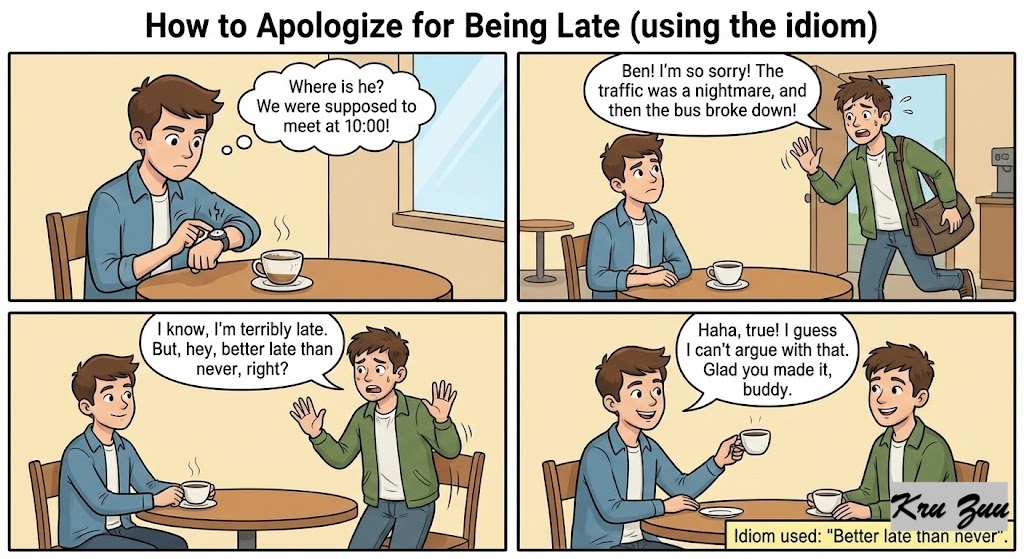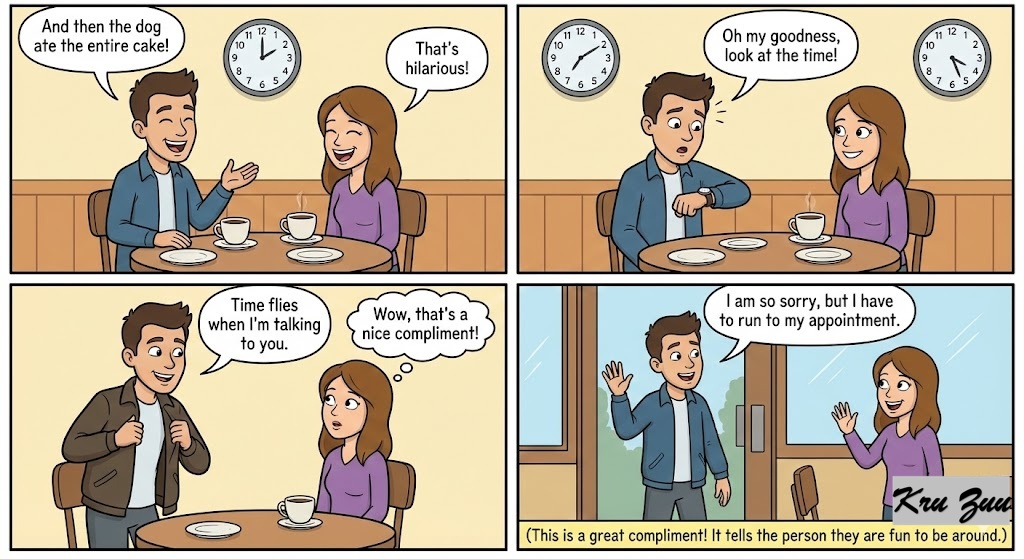 Situation: You are having coffee with a friend. You are talking and laughing. You realize you are late for your next meeting.