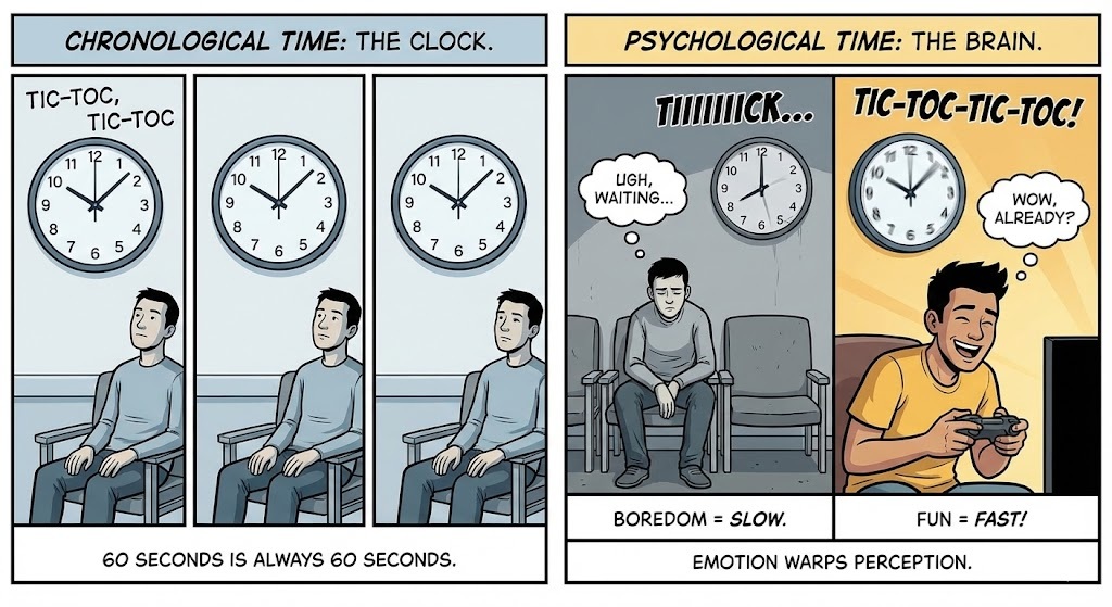 Chronological Time vs. Psychological Time. The clock on the wall never changes its speed. One minute is always 60 seconds. However, your brain processes time differently based on emotion.