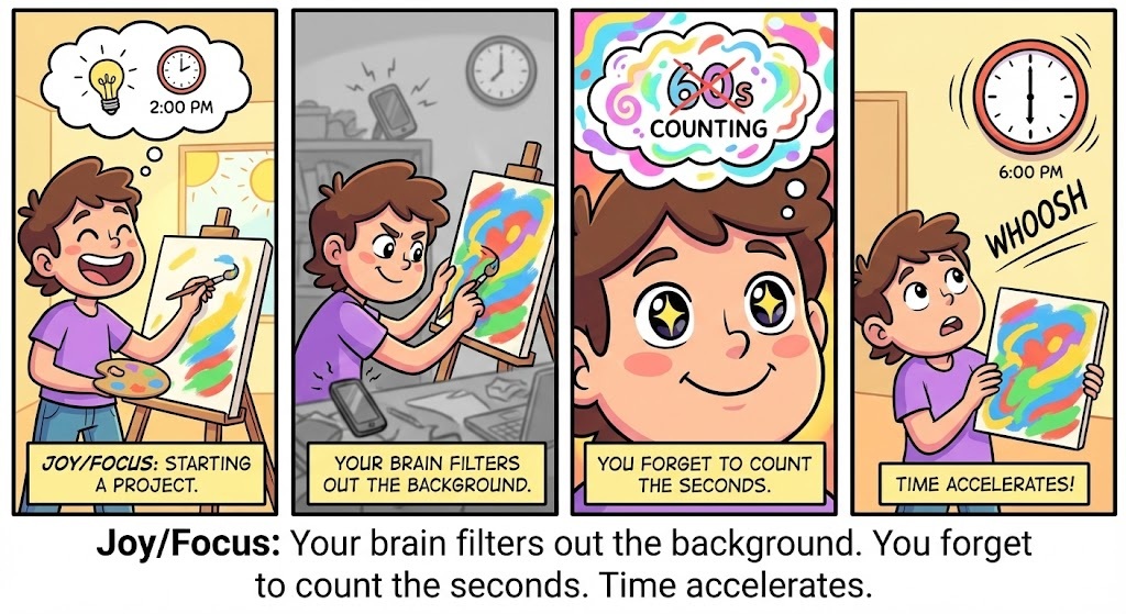 Joy/Focus: Your brain filters out the background. You forget to count the seconds. Time accelerates.