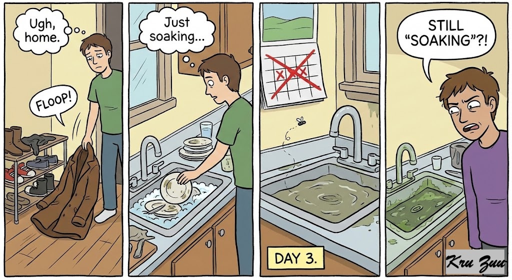 You drop your coat on the floor. You leave dishes in the sink “to soak” (for three days).