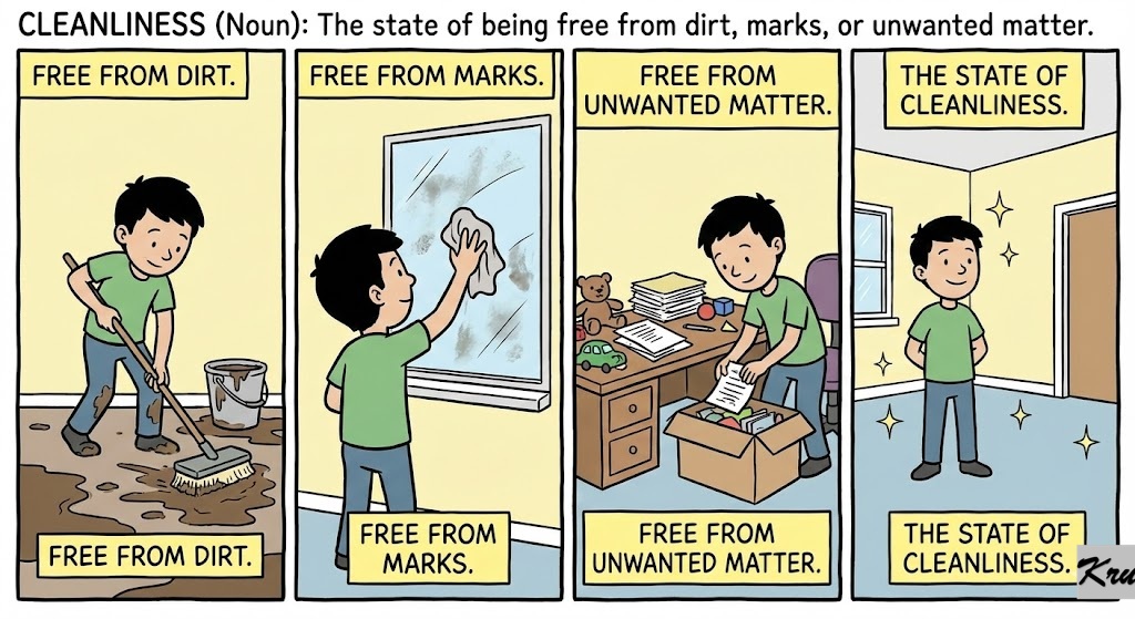 Cleanliness (Noun): The state of being free from dirt, marks, or unwanted matter.