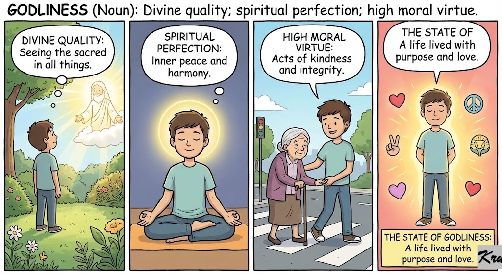 Godliness (Noun): Divine quality; spiritual perfection; high moral virtue.