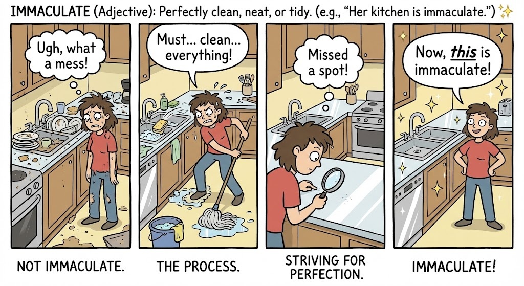 Immaculate (Adjective): Perfectly clean, neat, or tidy. (e.g., “Her kitchen is immaculate.”) ✨