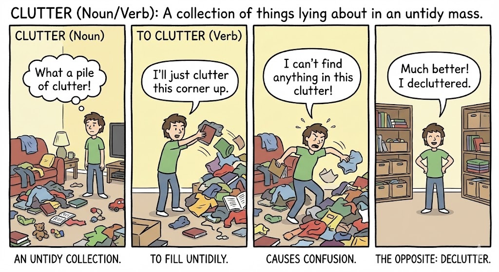 Clutter (Noun/Verb): A collection of things lying about in an untidy mass.