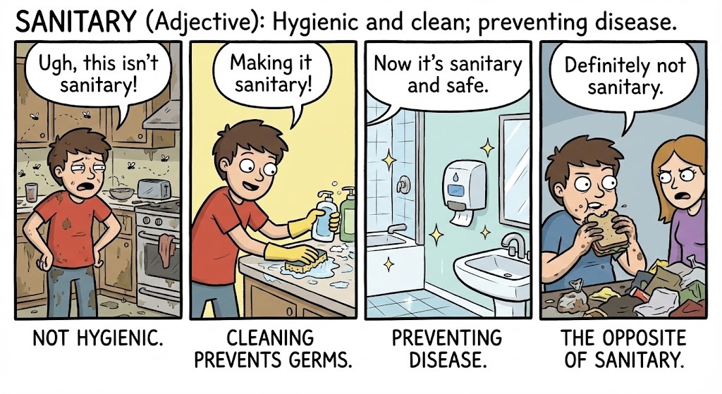 Sanitary (Adjective): Hygienic and clean; preventing disease.