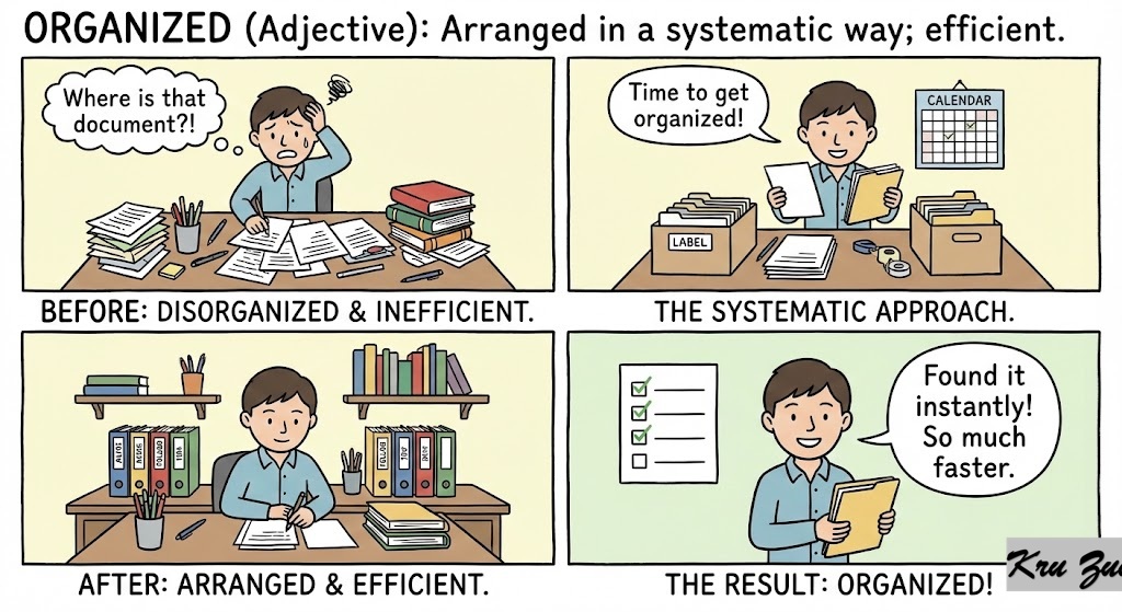 Organized (Adjective): Arranged in a systematic way; efficient.