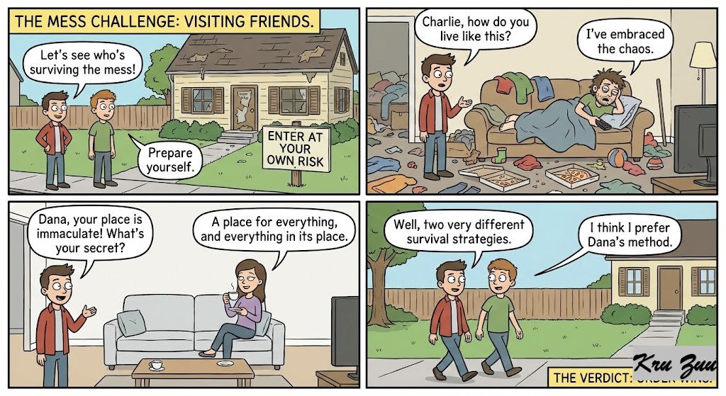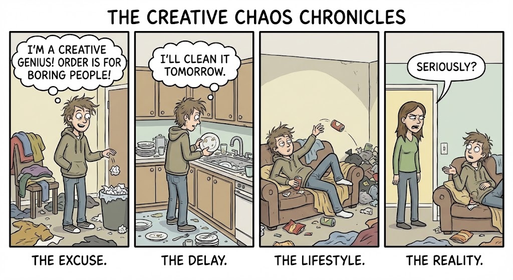 You say: “I’m a creative genius! Order is for boring people!” or “I’ll clean it tomorrow.” 🌪️ You treat your environment like a trash can.