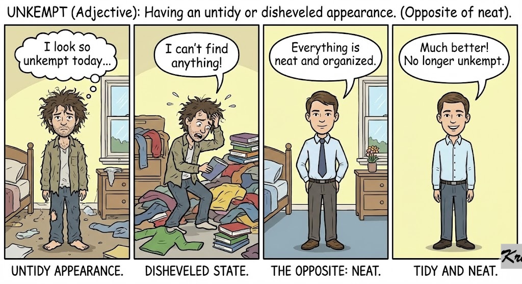 Unkempt (Adjective): Having an untidy or disheveled appearance. (Opposite of neat).