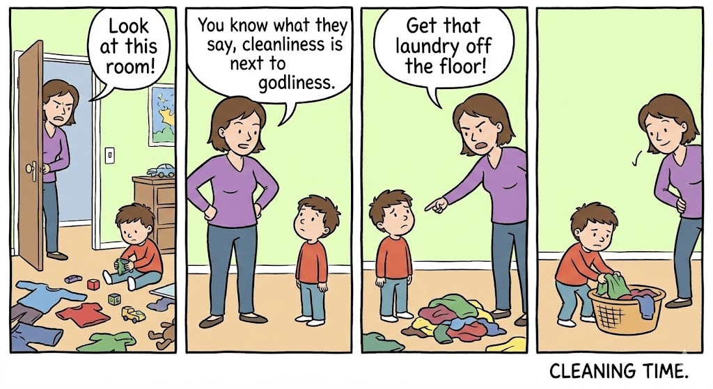 Parent to Child: “Look at this room! You know what they say, cleanliness is next to godliness. Get that laundry off the floor!”