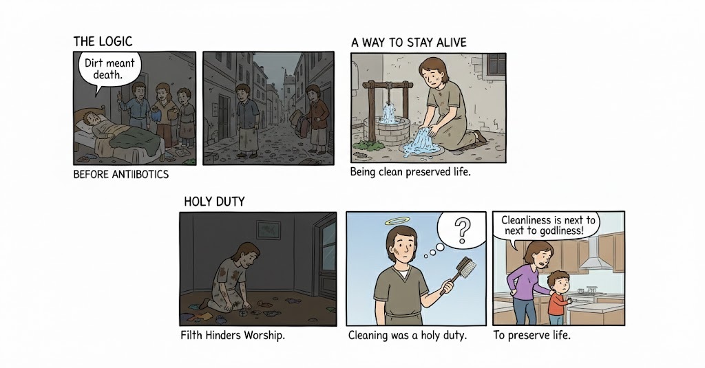 The Logic: Before antibiotics, dirt meant death. Being clean was literally a way to stay alive. Therefore, cleaning was seen as a holy duty to preserve life.
