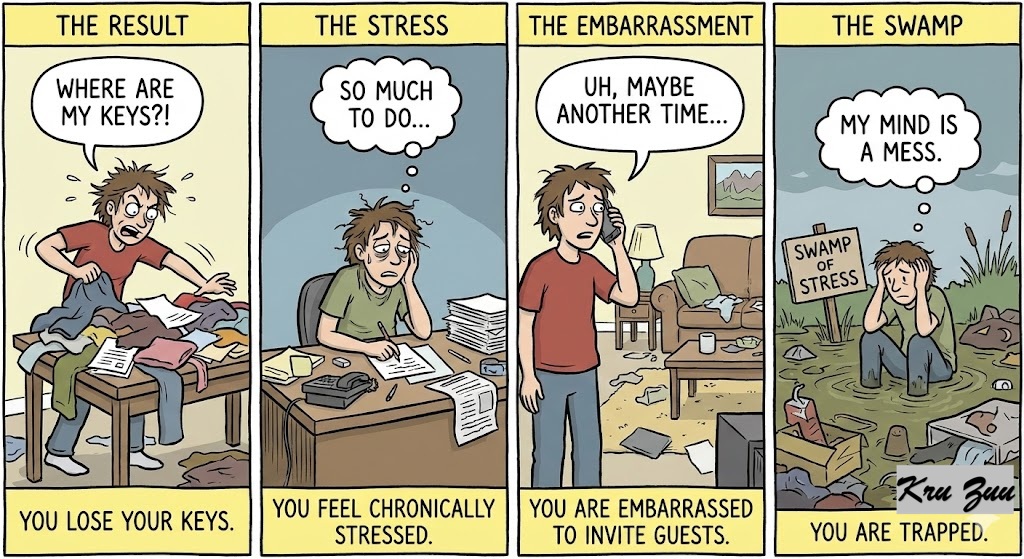The Result? You lose your keys. You feel chronically stressed. You are embarrassed to invite guests over. Your mind feels as cluttered as your desk. You are trapped in the “Swamp of Stress.” 😫