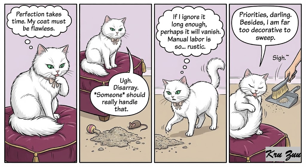 Cleo the Cat: Elegant, well-groomed personally, but hates doing chores. 😼