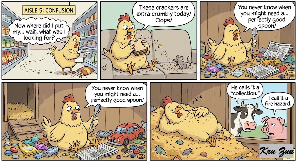 Cluck the Chicken: Scatterbrained, leaves crumbs everywhere, a “hoarder.” 🐔