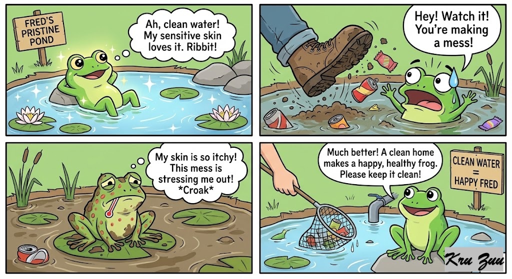 Fred the Frog: Sensitive skin, needs clean water, gets stressed by mess. 🐸