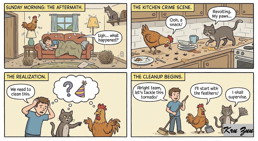 🎭 Short Story: The Dust Bunny Disaster 🧹🐱🐔🐸