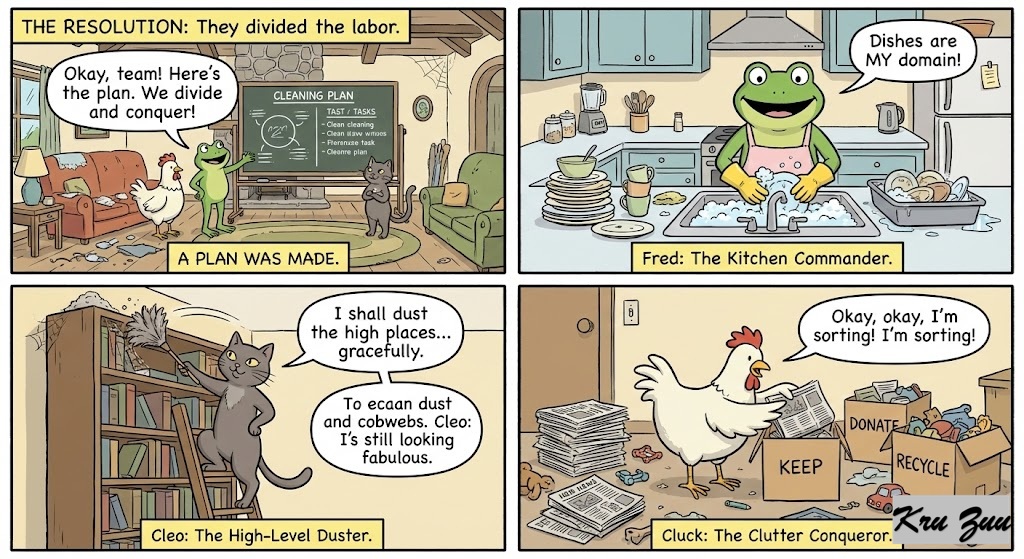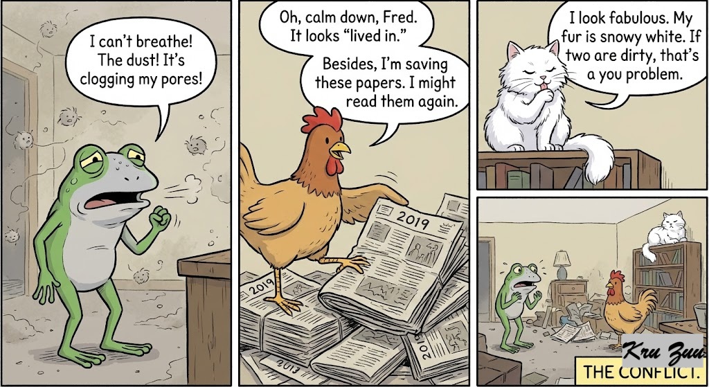 The Conflict: “I can’t breathe!” Fred wheezes, his green skin turning a pale grey. “The dust! It’s clogging my pores!” Cluck steps over a pile of old newspapers. “Oh, calm down, Fred. It looks ‘lived in.’ Besides, I’m saving these papers. I might read them again.” (The papers are from 2019). Cleo is sitting on the highest shelf, licking her paw. “I look fabulous,” she purrs. “My fur is snowy white. If you two are dirty, that’s a you problem.”