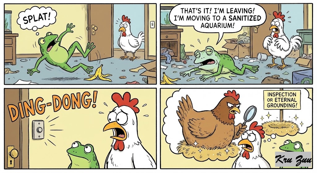 The Crisis: Fred tries to hop to the kitchen, but he slips on a banana peel Cluck dropped. SPLAT! “That’s it!” Fred croaks. “I’m leaving! I’m moving to a sanitized aquarium!” Suddenly, the doorbell rings. DING-DONG. Cluck gasps. “Oh no! It’s my mother! The Great Hen! She’s coming to inspect the coop!” The Great Hen is famous for her immaculate nest. If she sees this mess, Cluck will be grounded for eternity.