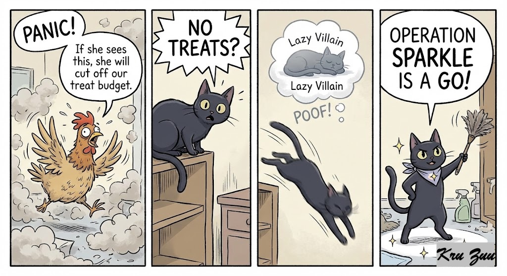 The Reaction: “Panic!” Cluck squawks, flapping wings and blowing more dust into the air. Cleo looks down. “If she sees this, she will cut off our treat budget.” Cleo’s eyes widen. “No treats?” Suddenly, the “Lazy Villain” vanished. Cleo jumped down. “Operation Sparkle is a go!”