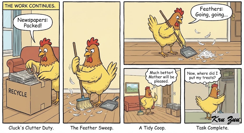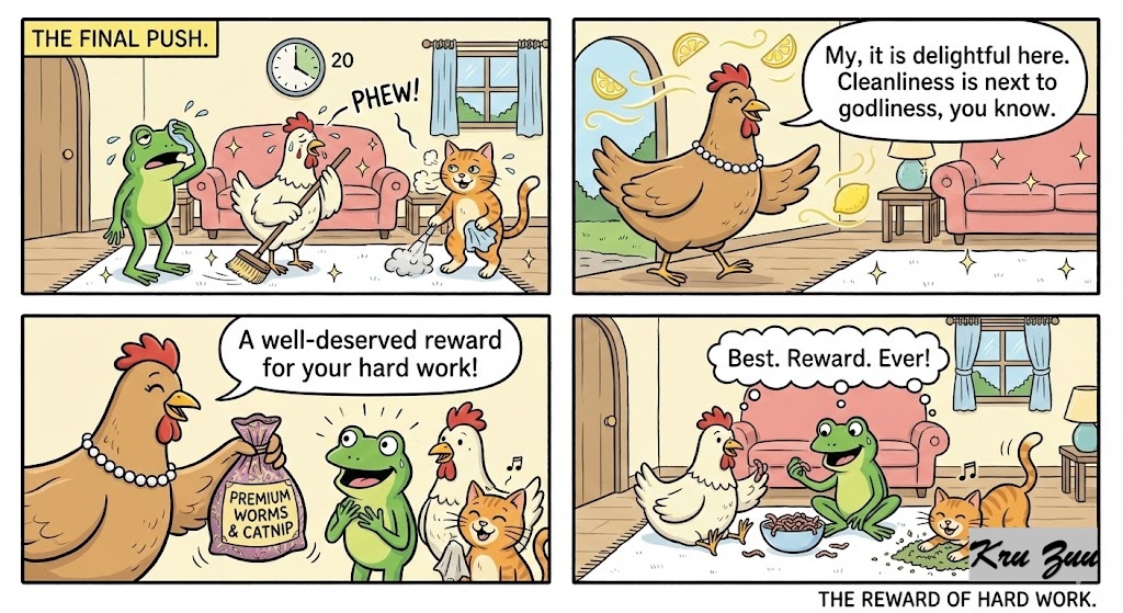 They worked for 20 minutes, sweating and grunting. When the Great Hen entered, the cottage smelled like lemons. “My,” she clucked. “It is delightful here. Cleanliness is next to godliness, you know.” She gave them a bag of premium worms and catnip.