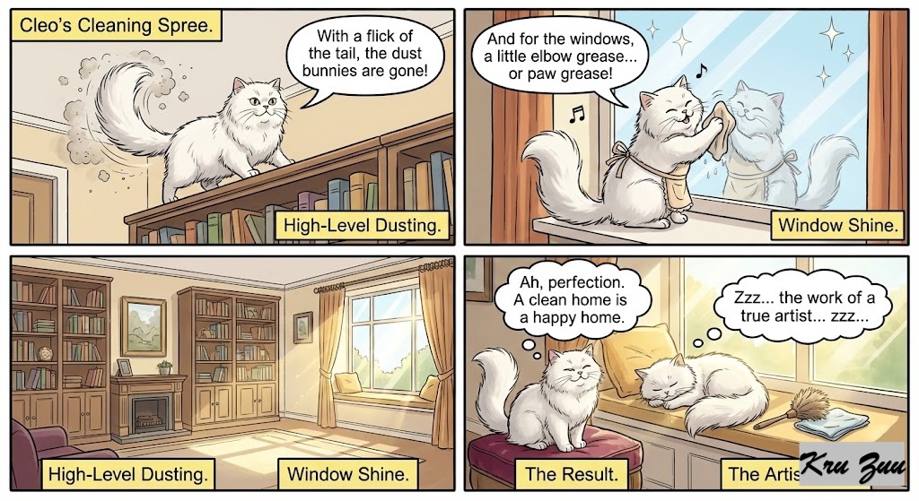 Cleo: Used her tail to dust the high shelves and polished the windows.