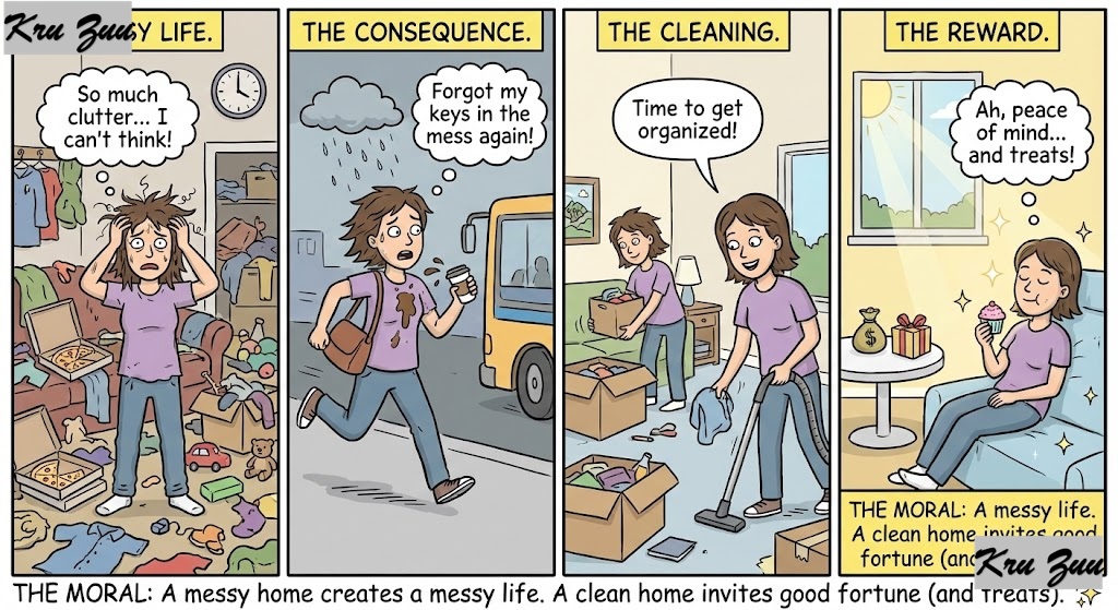 The Moral: A messy home creates a messy life. A clean home invites good fortune (and treats). ✨
