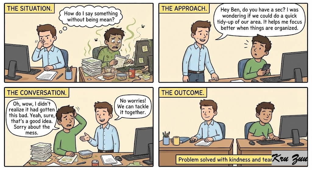 Situation: Your roommate or colleague has a messy desk or bad hygiene. You don’t want to be mean, but it bothers you.
