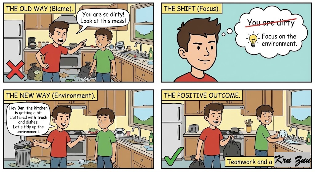 The Shift: Don’t say “You are dirty.” Focus on the environment.