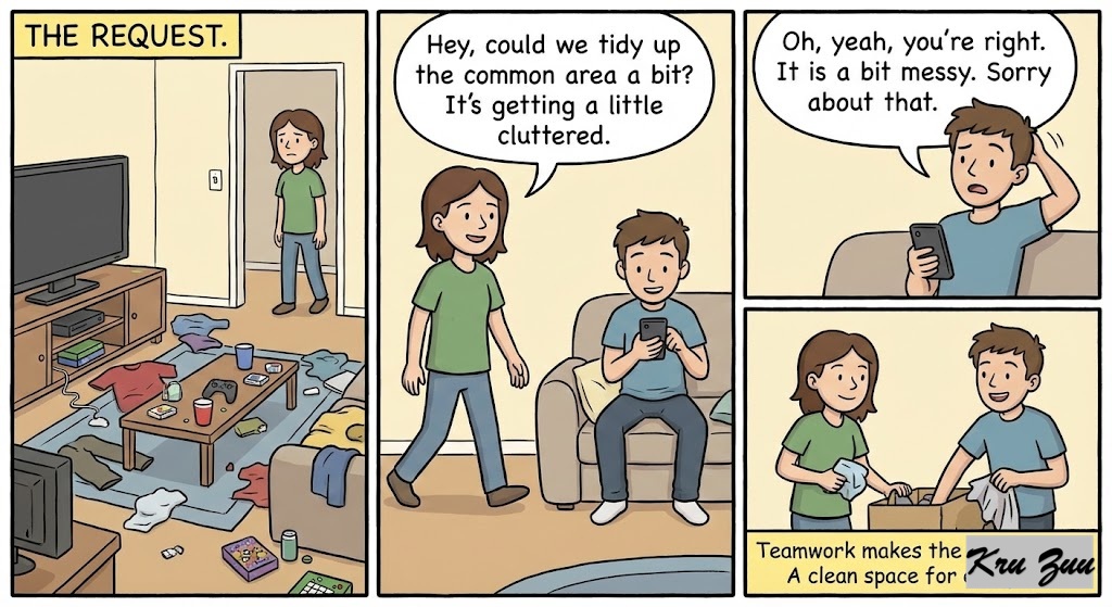 You Say:“Hey, could we tidy up the common area a bit? It’s getting a little cluttered.”