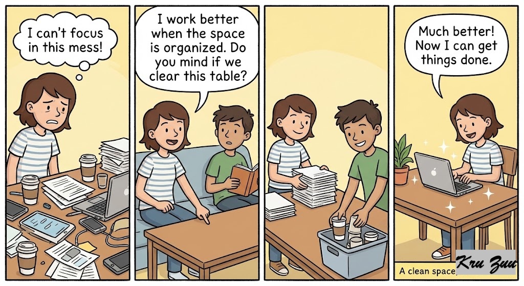 “I work better when the space is organized. Do you mind if we clear this table?”
