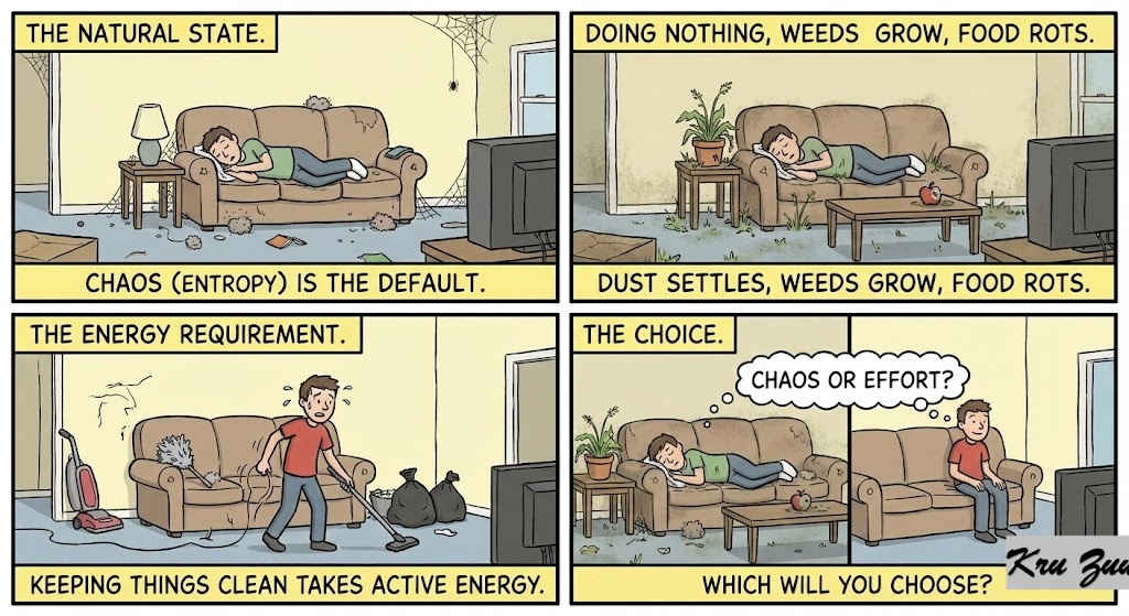 The universe naturally moves toward chaos (entropy). If you do nothing, dust settles, weeds grow, and food rots. Keeping things clean requires active energy.