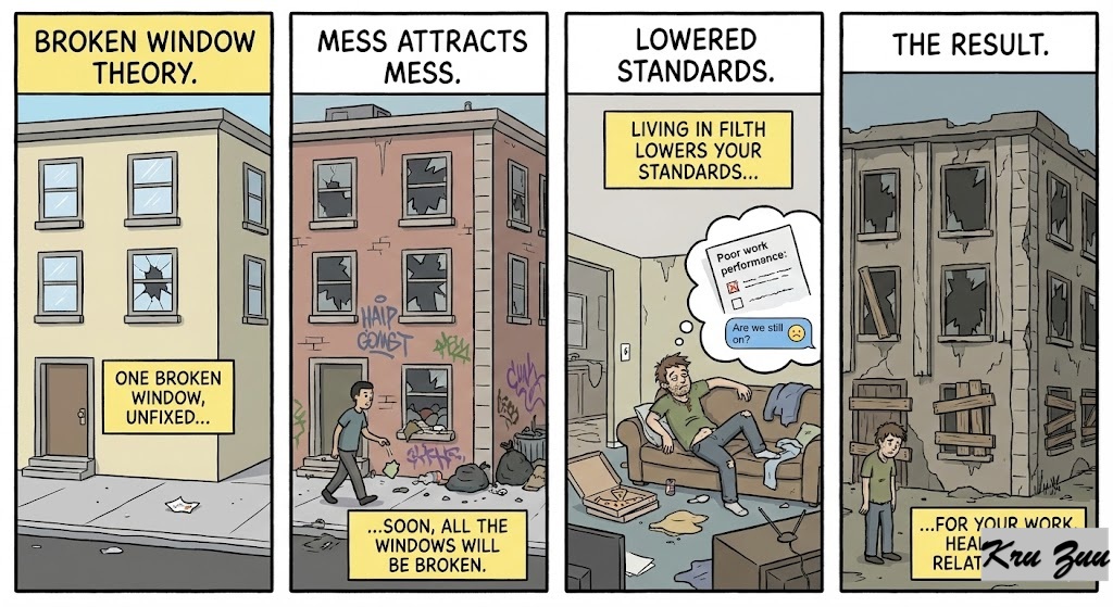 Think of the “Broken Window Theory.” If a building has one broken window that isn’t fixed, soon all the windows will be broken. Mess attracts more mess. If you live in filth, your standards for your work, your health, and your relationships will lower.