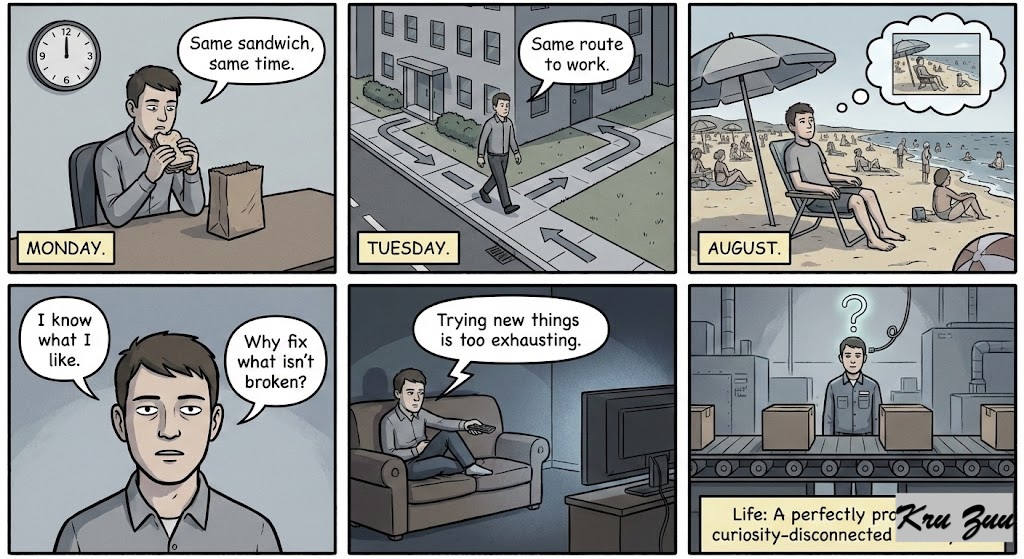 You eat the exact same sandwich every day. You take the exact same route to work. You go to the same vacation spot every year. 🥱 “I know what I like.” “Why fix what isn’t broken?” “Trying new things is too exhausting.” You treat your life like a perfectly programmed, but incredibly boring, factory line. You disconnect yourself from curiosity.