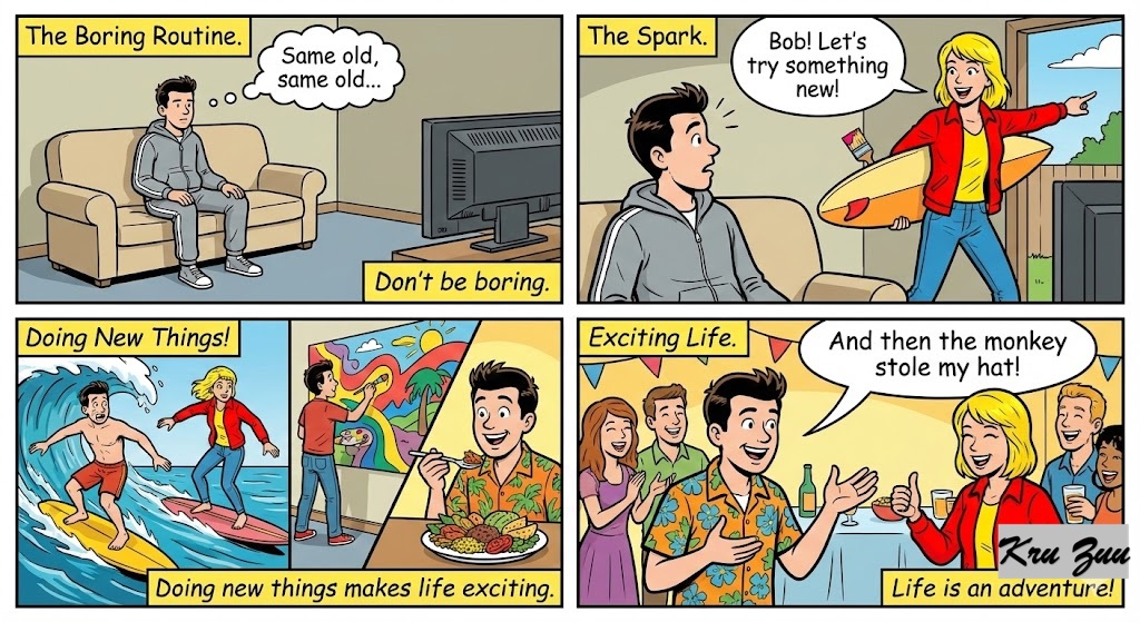 Simpler Version: Doing new things makes life exciting. / Don’t be boring.