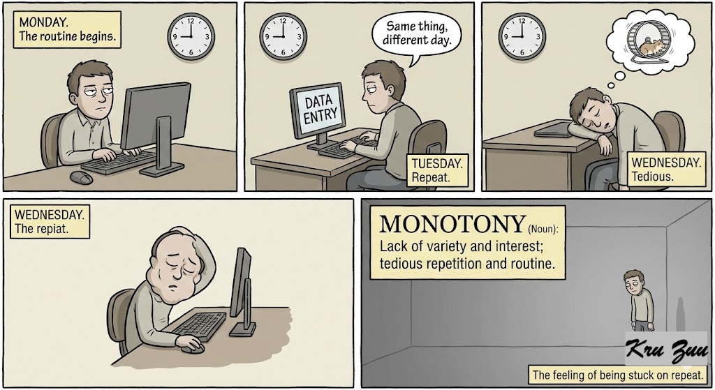 Monotony (Noun): Lack of variety and interest; tedious repetition and routine.