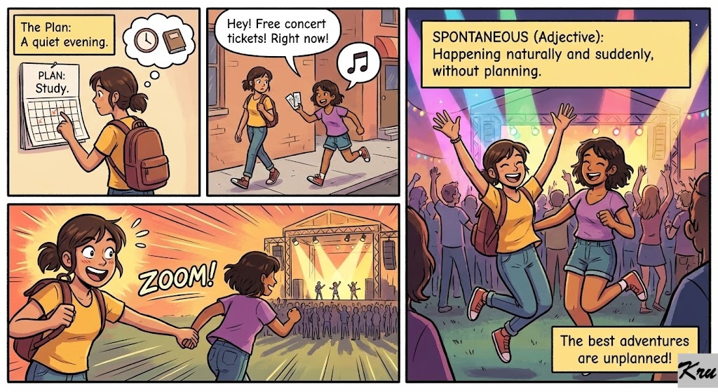 Spontaneous (Adjective): Happening naturally and suddenly, without planning.