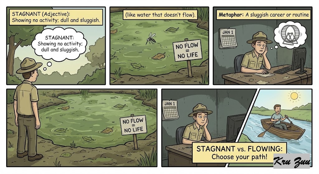 Stagnant (Adjective): Showing no activity; dull and sluggish (like water that doesn’t flow). 🌊