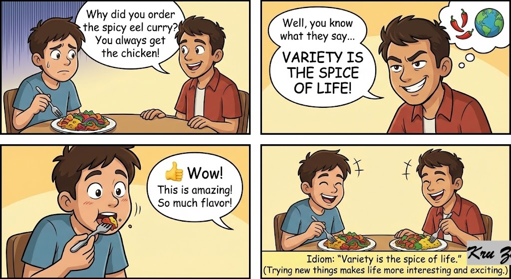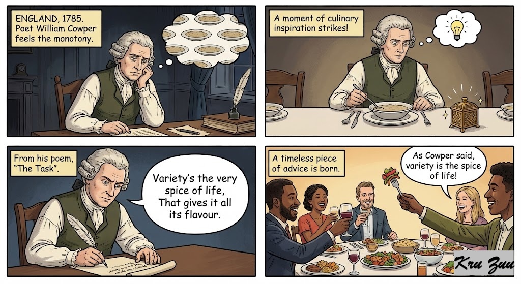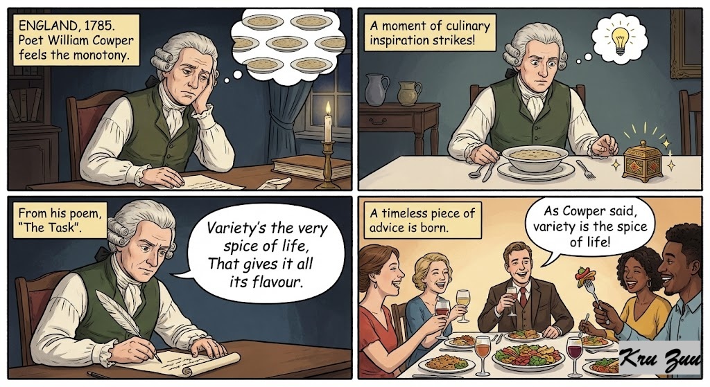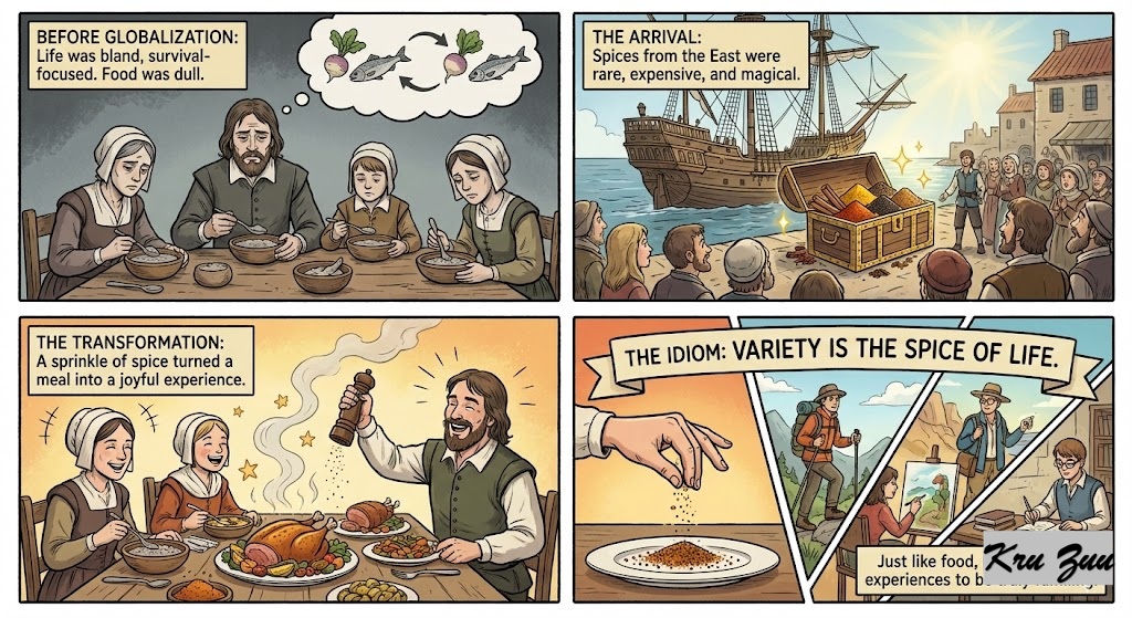 The Logic: Before modern globalization, food in Europe could be incredibly bland, lots of boiled root vegetables and salted meats. Spices from the East were rare, expensive, and magical. Adding spice completely transformed a dull, survival-focused meal into a joyful experience. The idiom beautifully maps the joy of a good meal onto the journey of life.