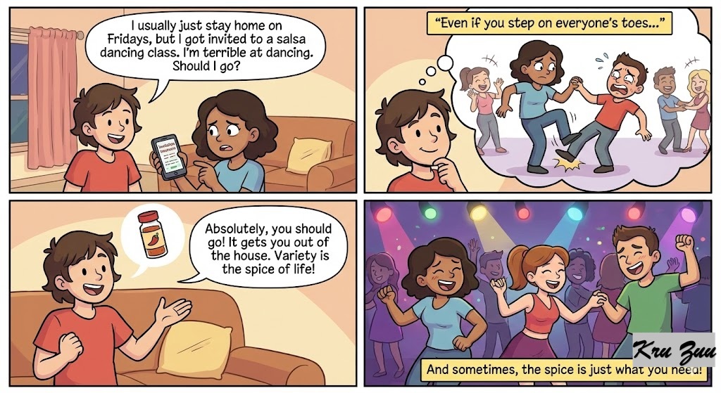 Friend: “I usually just stay home on Fridays, but I got invited to a salsa dancing class. I’m terrible at dancing. Should I go?” You: “Absolutely, you should go! Even if you step on everyone’s toes, it gets you out of the house. Variety is the spice of life!”