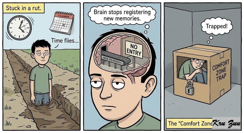 The Result? You feel stuck in a rut. Time passes incredibly fast because your brain stops registering new memories. You are trapped in the “Comfort Zone Trap.” 📦