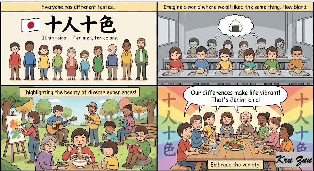 🇯🇵 Japanese:“十人十色” (Jūnin toiro — Ten men, ten colors. Meaning everyone has different tastes, highlighting the beauty of diverse experiences).