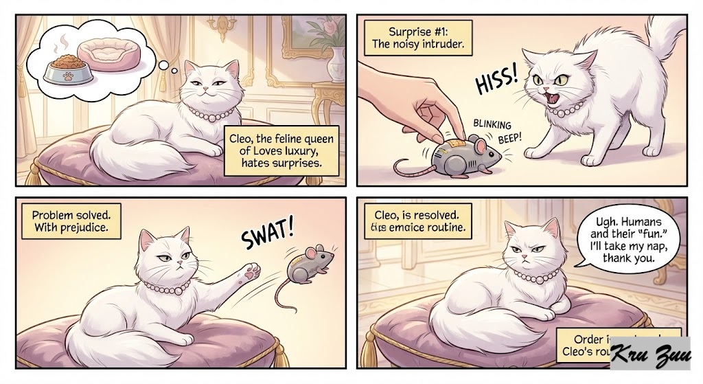 Cleo the Cat: Elegant, loves her luxury routine, hates surprises. 😼