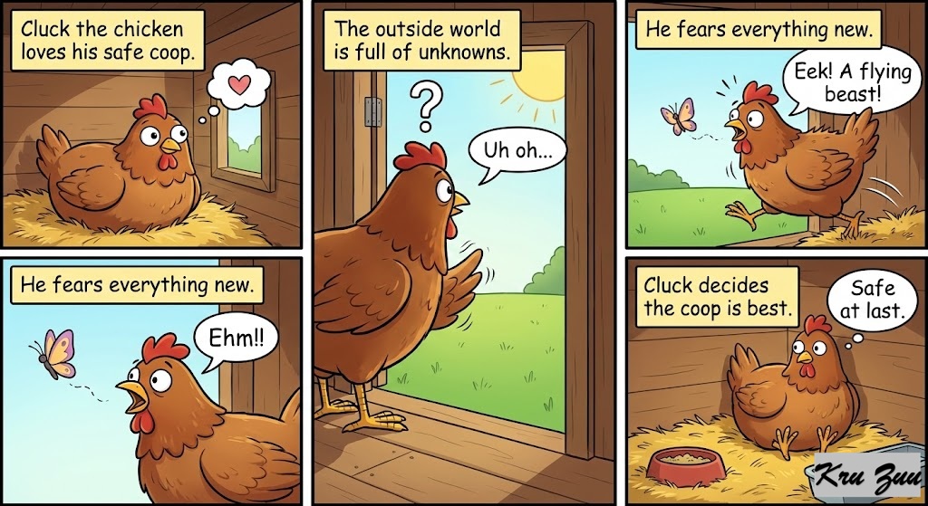 Cluck the Chicken: Nervous, likes staying in the coop, fears the unknown. 🐔