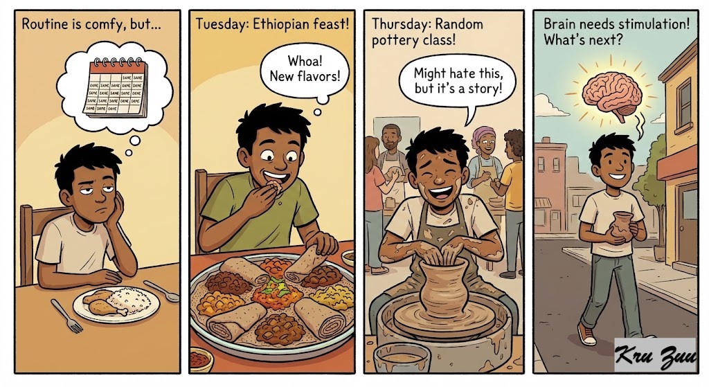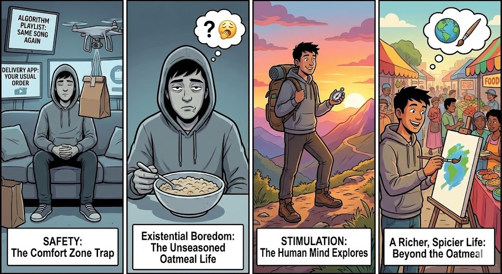 Safety vs. Stimulation. We live in a world where it is incredibly easy to be comfortable. Algorithms feed us the exact same type of music we already like; delivery apps bring us the exact same meals. But the human mind is designed to explore. If you treat life like a bowl of unseasoned oatmeal (safe, but bland), you will soon find yourself suffering from a severe case of existential boredom.