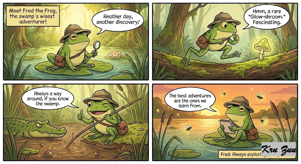 Fred the Frog: The wise, green adventurer who loves exploring the swamp. 🐸