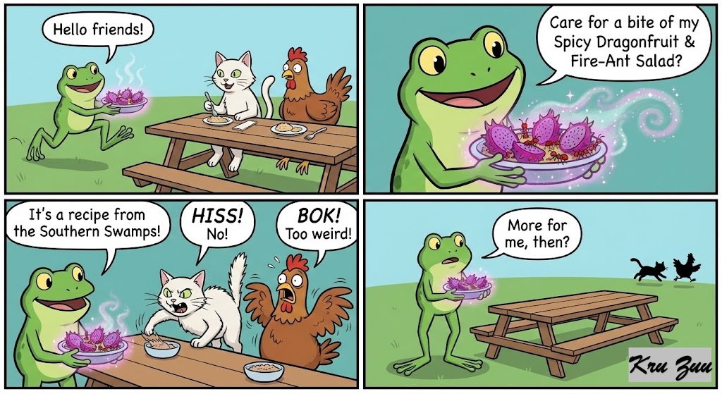 The Conflict: Fred hops over holding a glowing, purple dish. It smells sweet, spicy, and entirely weird. “Hello friends!” Fred ribbits. “Care for a bite of my Spicy Dragonfruit & Fire-Ant Salad? It’s a recipe from the Southern Swamps!”