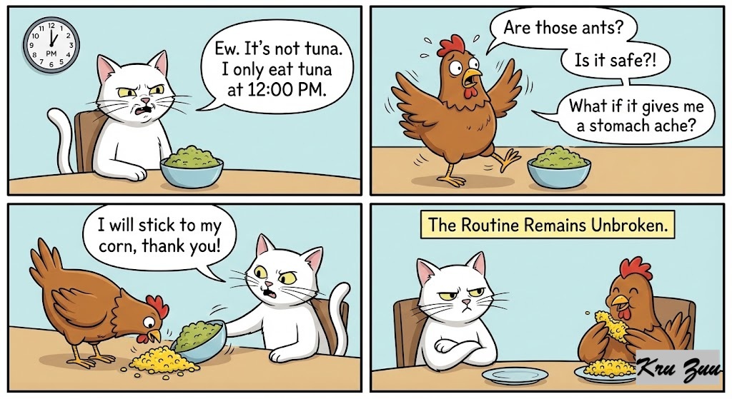 Cleo wrinkles her nose in disgust. “Ew. It’s not tuna. I only eat tuna at 12:00 PM.” Cluck takes two steps back, flapping his wings. “Are those ants? Is it safe?! What if it gives me a stomach ache? I will stick to my corn, thank you!”