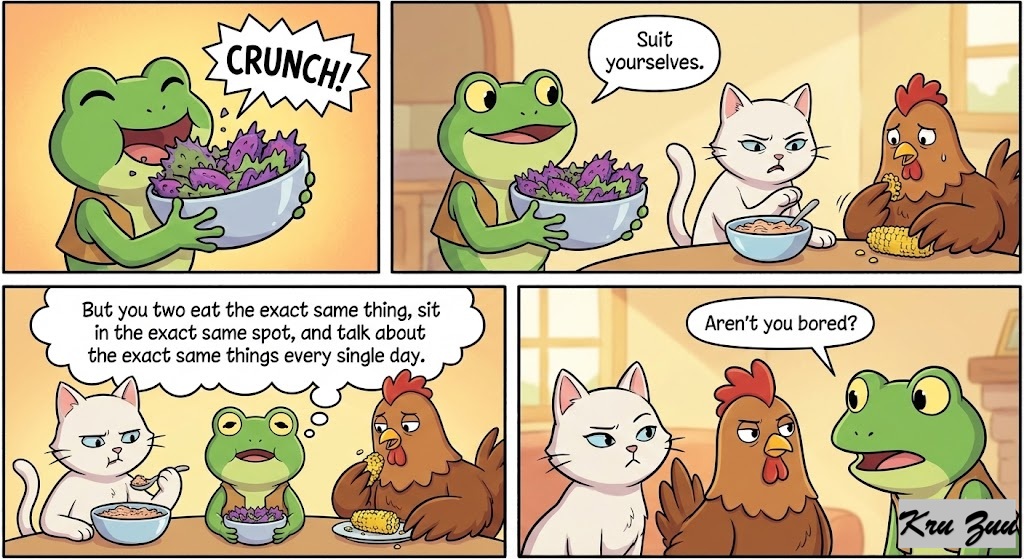 The Reaction: Fred takes a big, crunchy bite of his purple salad and smiles. “Suit yourselves. But you two eat the exact same thing, sit in the exact same spot, and talk about the exact same things every single day. Aren’t you bored?”