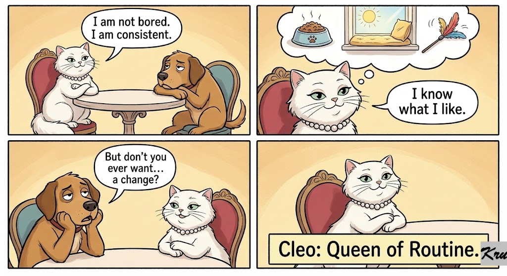 Cleo crosses her paws. “I am not bored. I am consistent. I know what I like.”