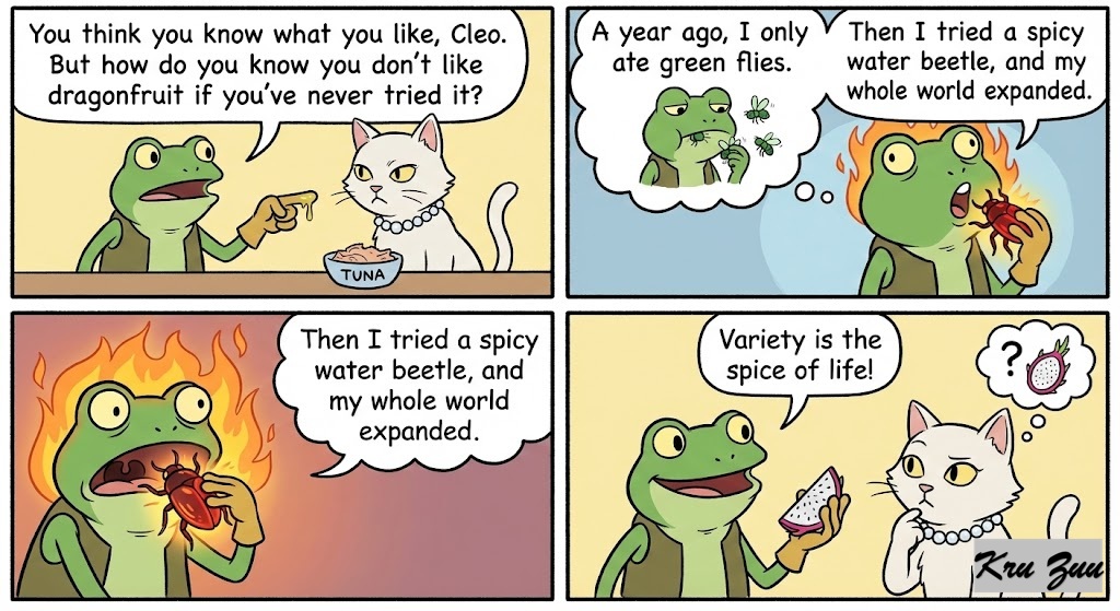 The Lesson: Fred points his sticky frog finger at Cleo. “You think you know what you like, Cleo. But how do you know you don’t like dragonfruit if you’ve never tried it? A year ago, I only ate green flies. Then I tried a spicy water beetle, and my whole world expanded. Variety is the spice of life!”