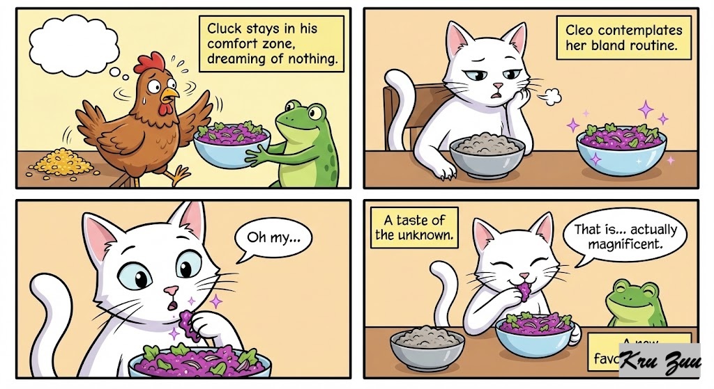 The Resolution: Cluck shakes his head, too scared to try, and goes back to his dry corn, dreaming of nothing. Cleo, however, looks at her bland, grey tuna. She sighs, dips one manicured claw into Fred’s purple salad, and tastes it. Her eyes go wide. It is sweet, tangy, and crunchy! “Oh my,” she purrs. “That is… actually magnificent.”